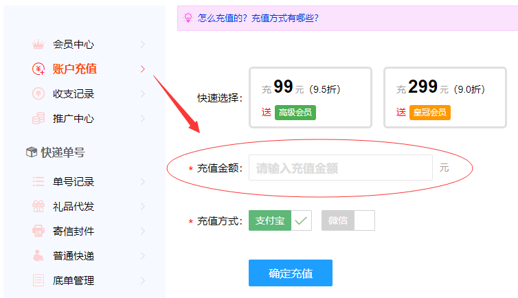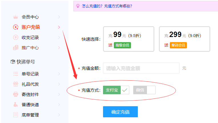 充值步骤一:进入充值页面,点击左侧的【账户充值】按钮。